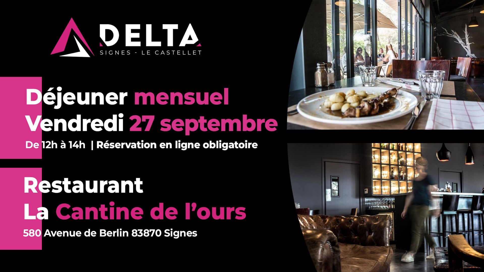 Le prochain déjeuner mensuel DELTA se déroulera le vendredi 27 septembre 2024 à La Cantine de l'ours dans le Parc d'activités de Signes. Le déjeuner est uniquement réservé aux adhérents et partenaires de l'association. LIEU / LA CANTINE DE L'OURS PARC D'ACTIVITÉS DE SIGNES 580 AVENUE DE BERLIN 83870 SIGNES TARIF / FORMULE à 25 € Plat + dessert Réservation en ligne obligatoire avant le 27/09/24 à 10h. PLACES LIMITÉES