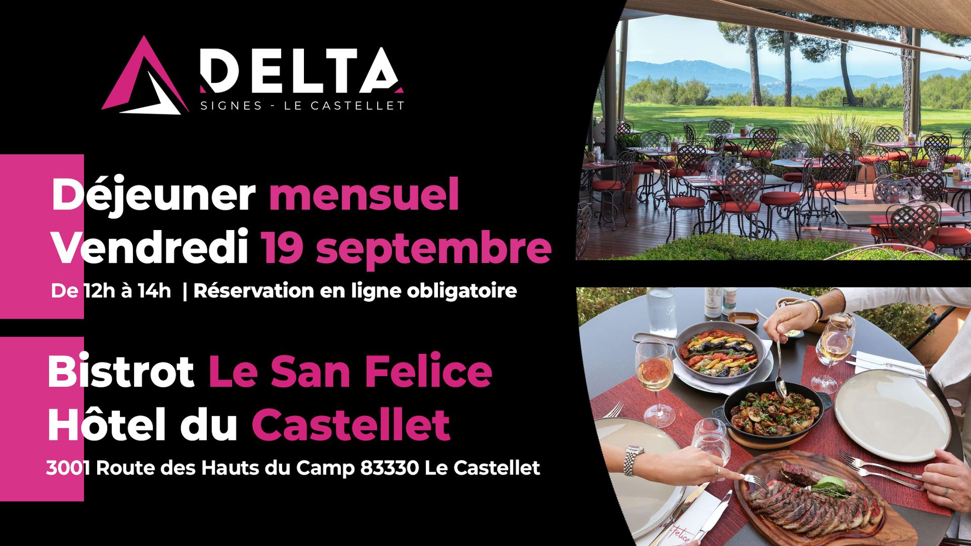 Le prochain déjeuner mensuel DELTA se déroulera le vendredi 19 septembre 2025 au Bistrot Le San Felice , un des restaurants de l'Hôtel du Castellet*****. Le déjeuner est uniquement réservé aux adhérents et partenaires de l'association. LIEU / LE SAN FELICE / HÔTEL DU CASTELLET 3001 ROUTE DES HAUTS DU CAMP 83330 LE CASTELLET TARIF / FORMULE à 59 € Plat + dessert + Eaux, café et vin Réservation en ligne obligatoire avant le 16/09/25.