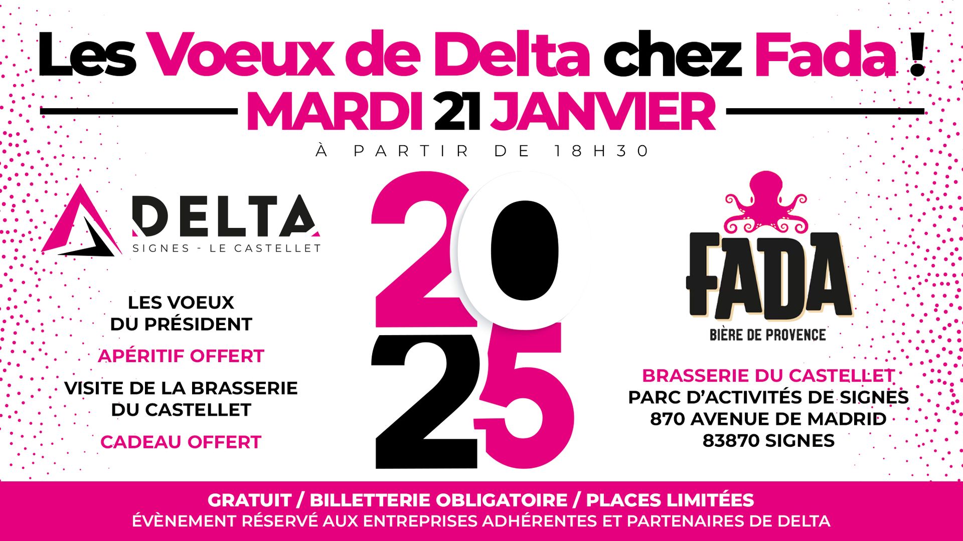 La cérémonie des vœux de DELTA se tiendra le mardi 21 décembre 2025 , dans les locaux de la Bière FADA , à partir de 18h30. Cet événement exclusif est réservé aux entreprises adhérentes et partenaires de l'association. L'inscription en ligne, gratuite mais obligatoire , est ouverte dès maintenant. Attention : les places sont limitées à deux participants par entreprise. LIEU / BIÈRE FADA BRASSERIE DU CASTELLET PARC D'ACTIVITÉS DE SIGNES 870 AVENUE DE MADRID 83870 SIGNES ÉVÈNEMENT GRATUIT / RÉSERVATION OBLIGATOIRE - Voeux du Président - Apéritif offert - Visite de La Brasserie du Castellet - Cadeau offert PLACES LIMITÉES